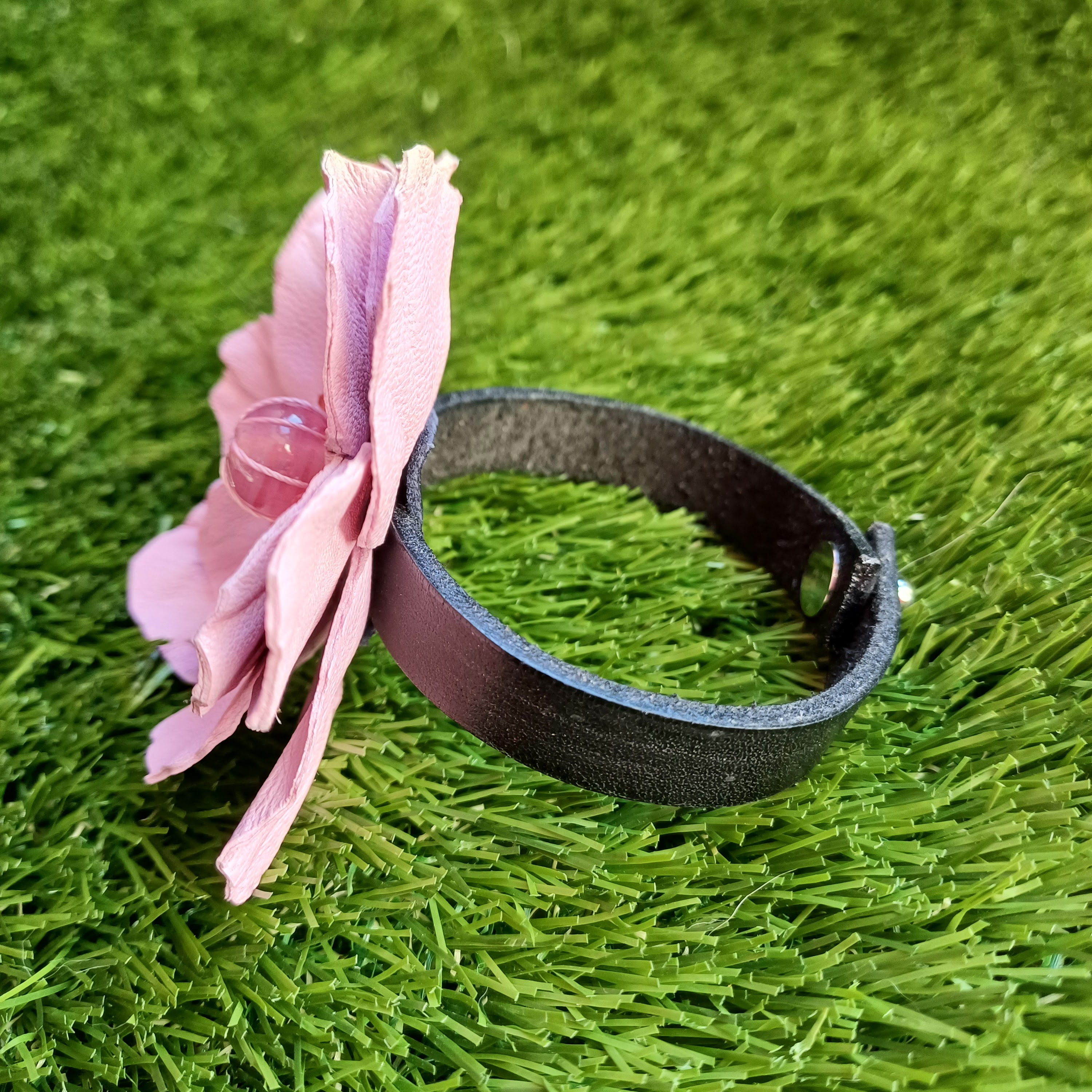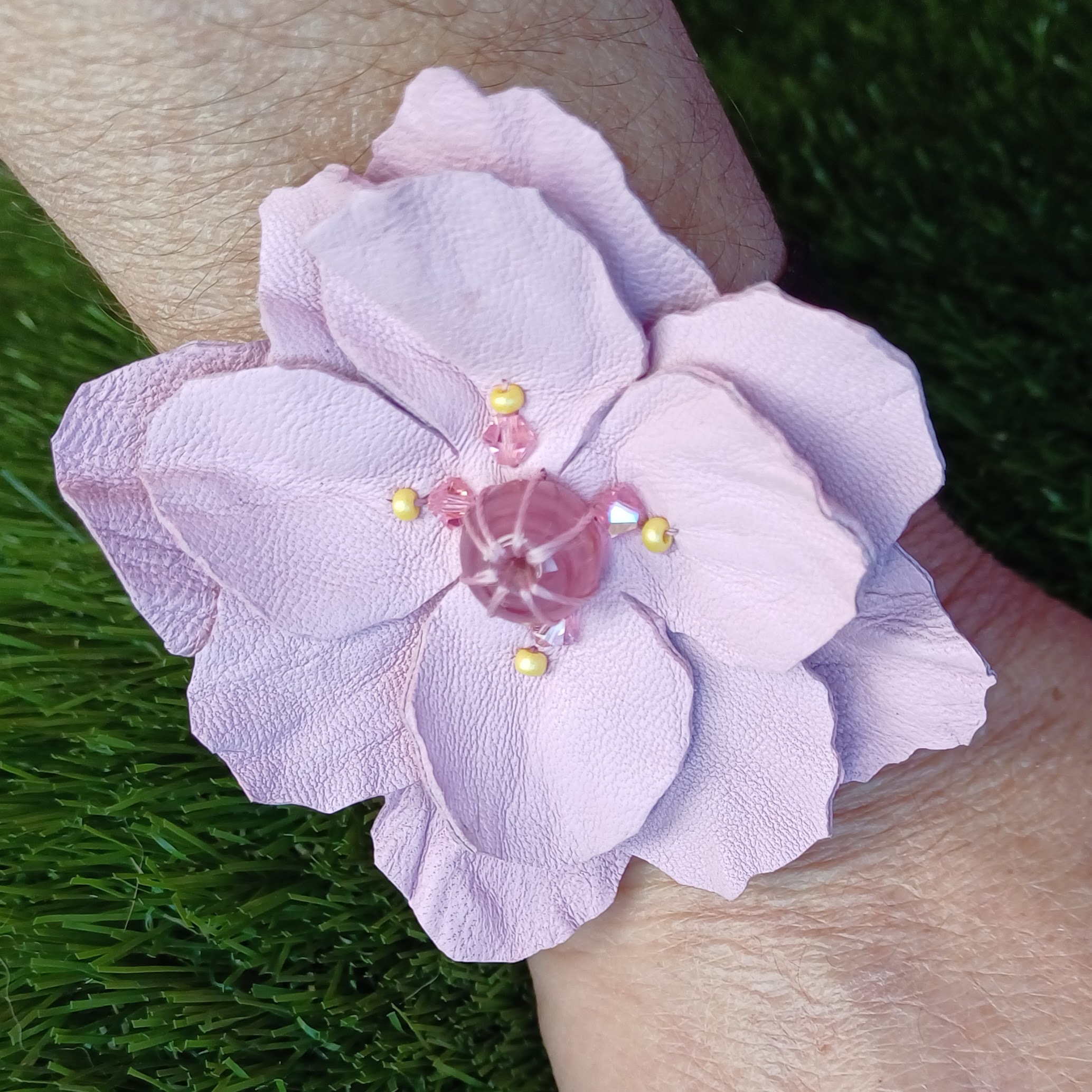 Fleur en cuir d’agneau, perles en verre, perles de swarovski, perles de rocailles.
