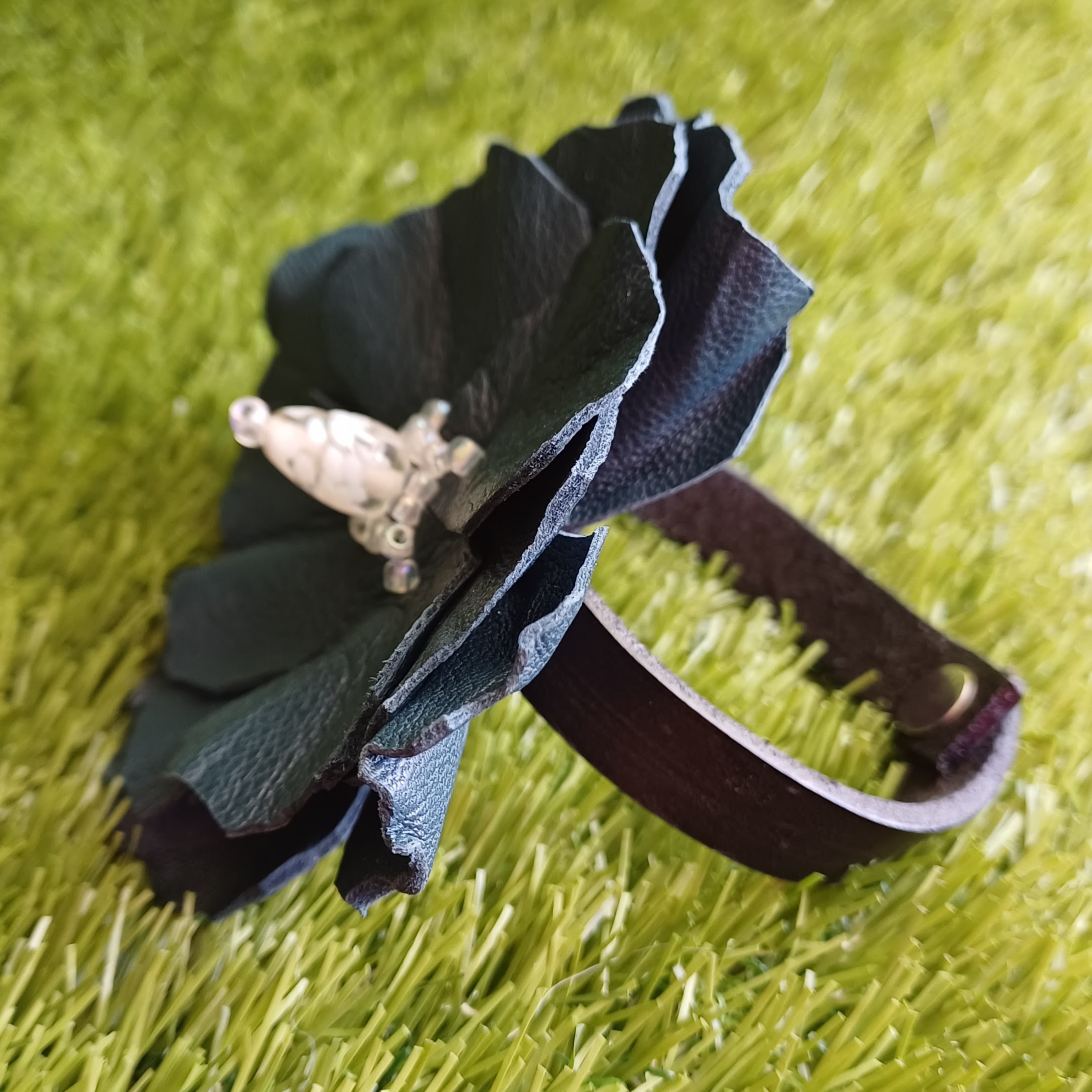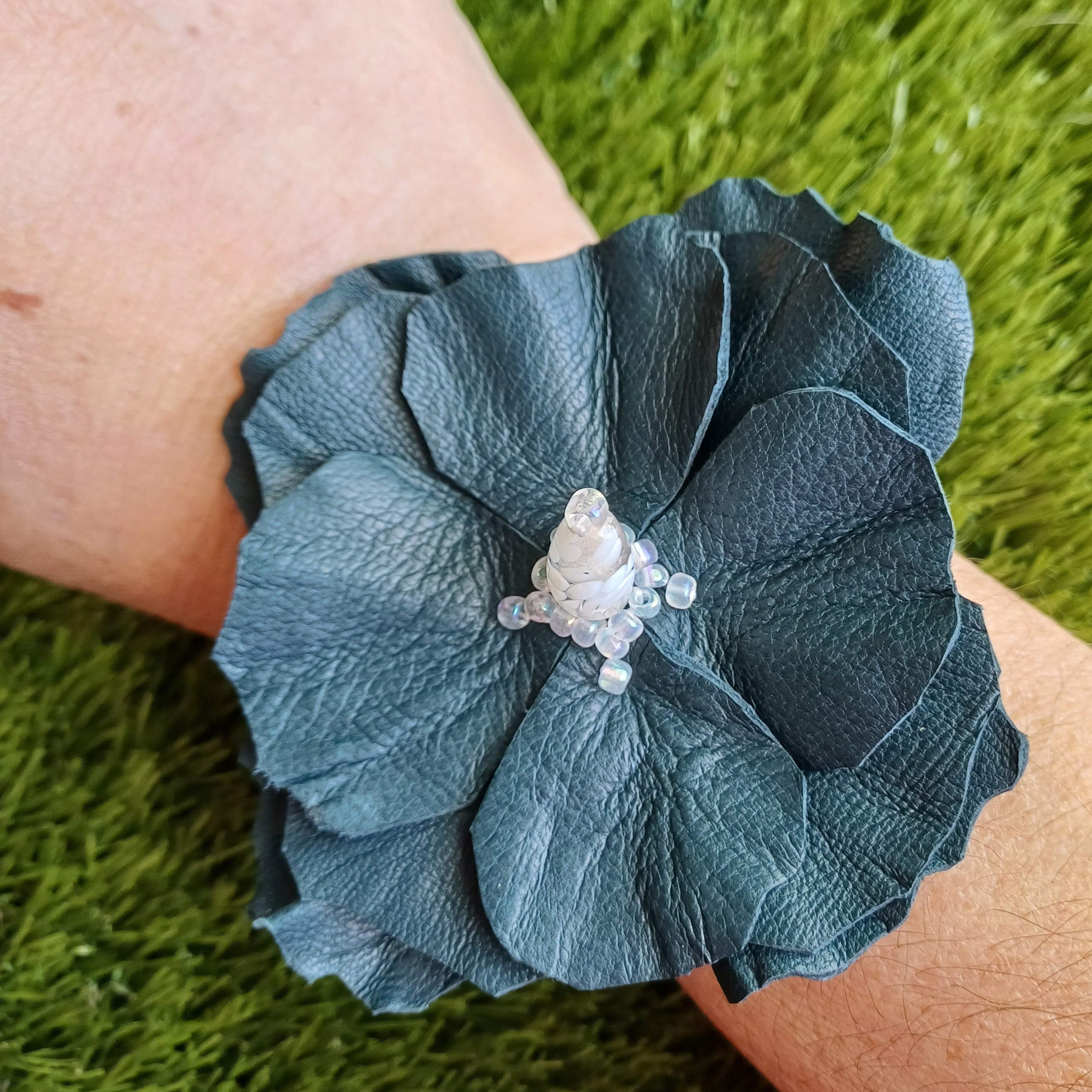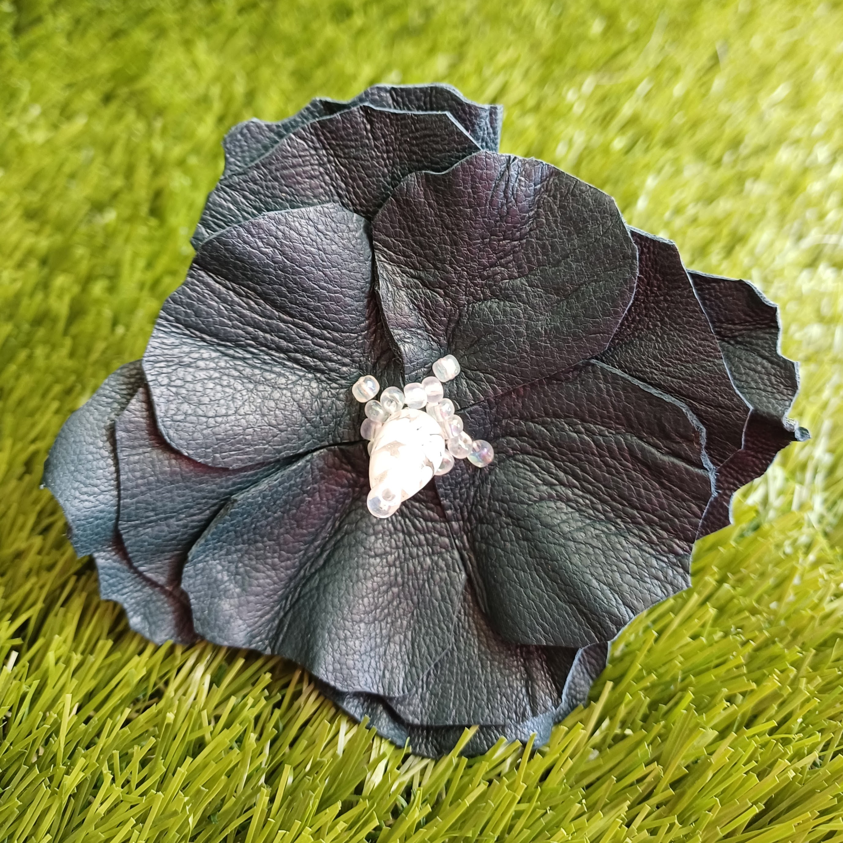 Fleur en cuir d’agneau, perle fantaisie en verre, perles de rocailles.