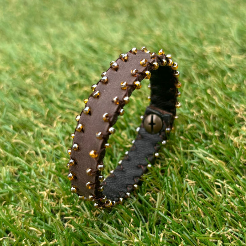 Manchette en cuir, doublure en cuir, perles de rocailles.
