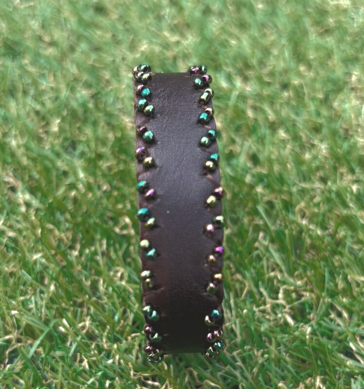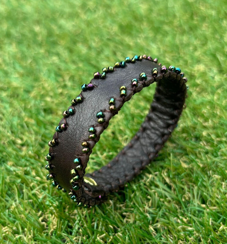 Bracelet en cuir, doublure en cuir, perles de rocailles.