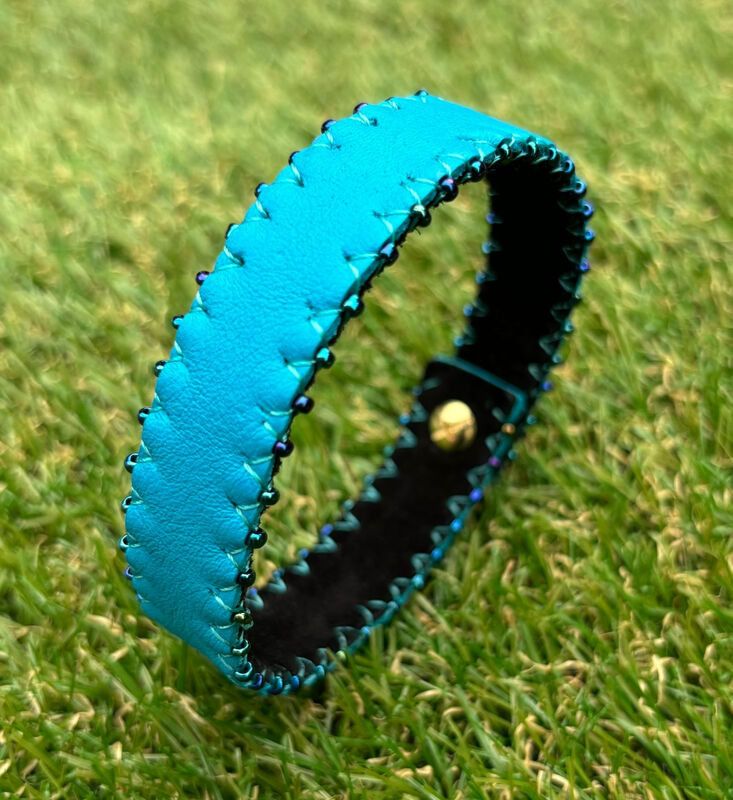 Bracelet en cuir, doublure en cuir, perles de rocailles.
