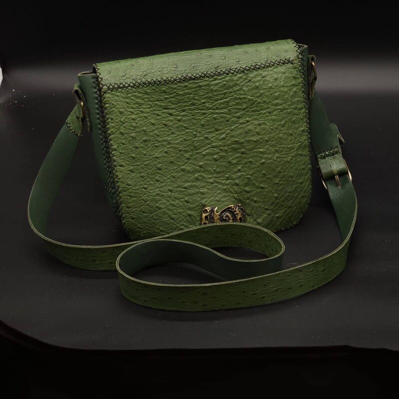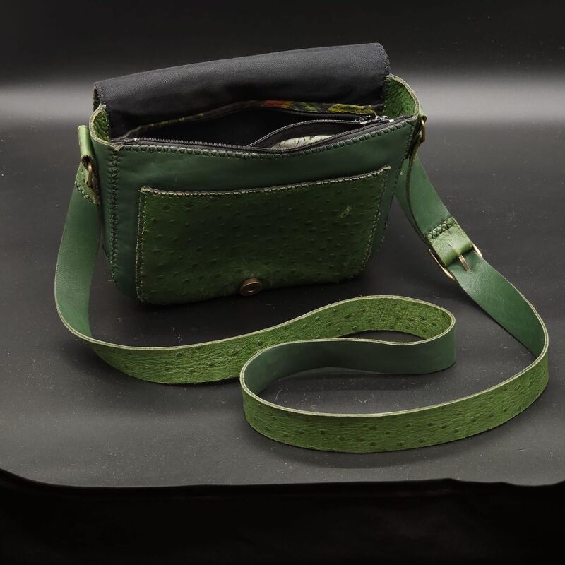 Sac bandoulièreen cuir de vachette façon autruche, anneaux et décoration en métal, fermeture magnétique. Bandouliière réglable.