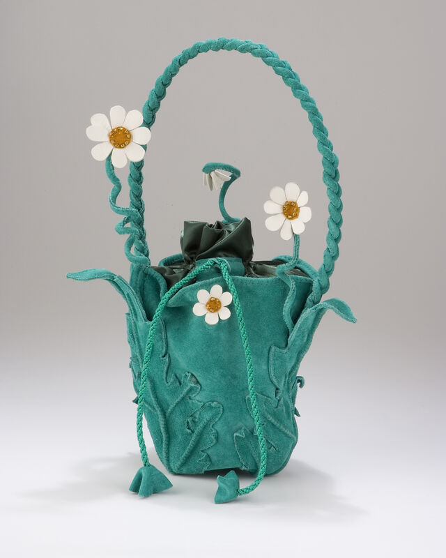 Sac à main en croute de porc et cuir d ‘agneau, agrémenté de perles de rocailles.