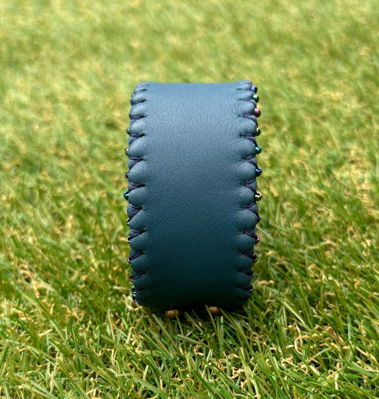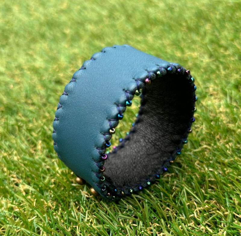 Manchette en cuir, doublure en cuir, perles de rocailles.