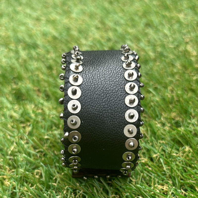 Manchette en cuir, doublure en cuir, sequins et perles de corailles.