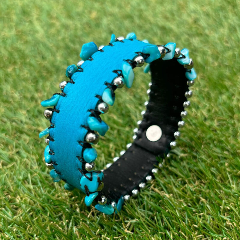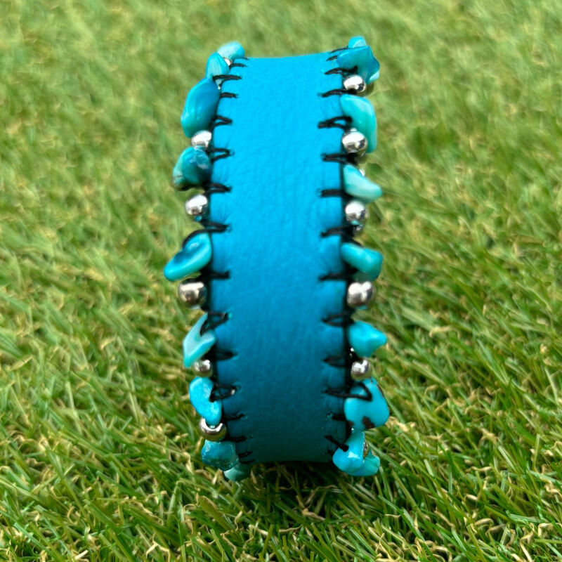 Manchette en cuir, doublure en cuir, perles turquoises et argentées.