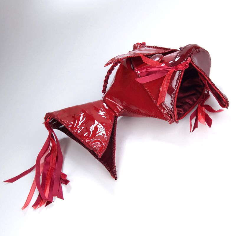 Sac à main en cuir vernis et cordellette, boutons en bois.
