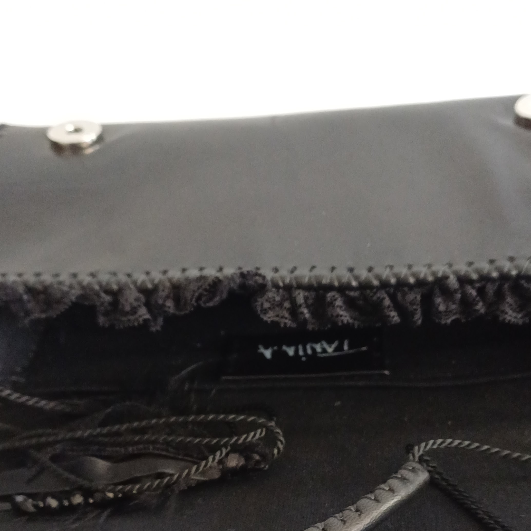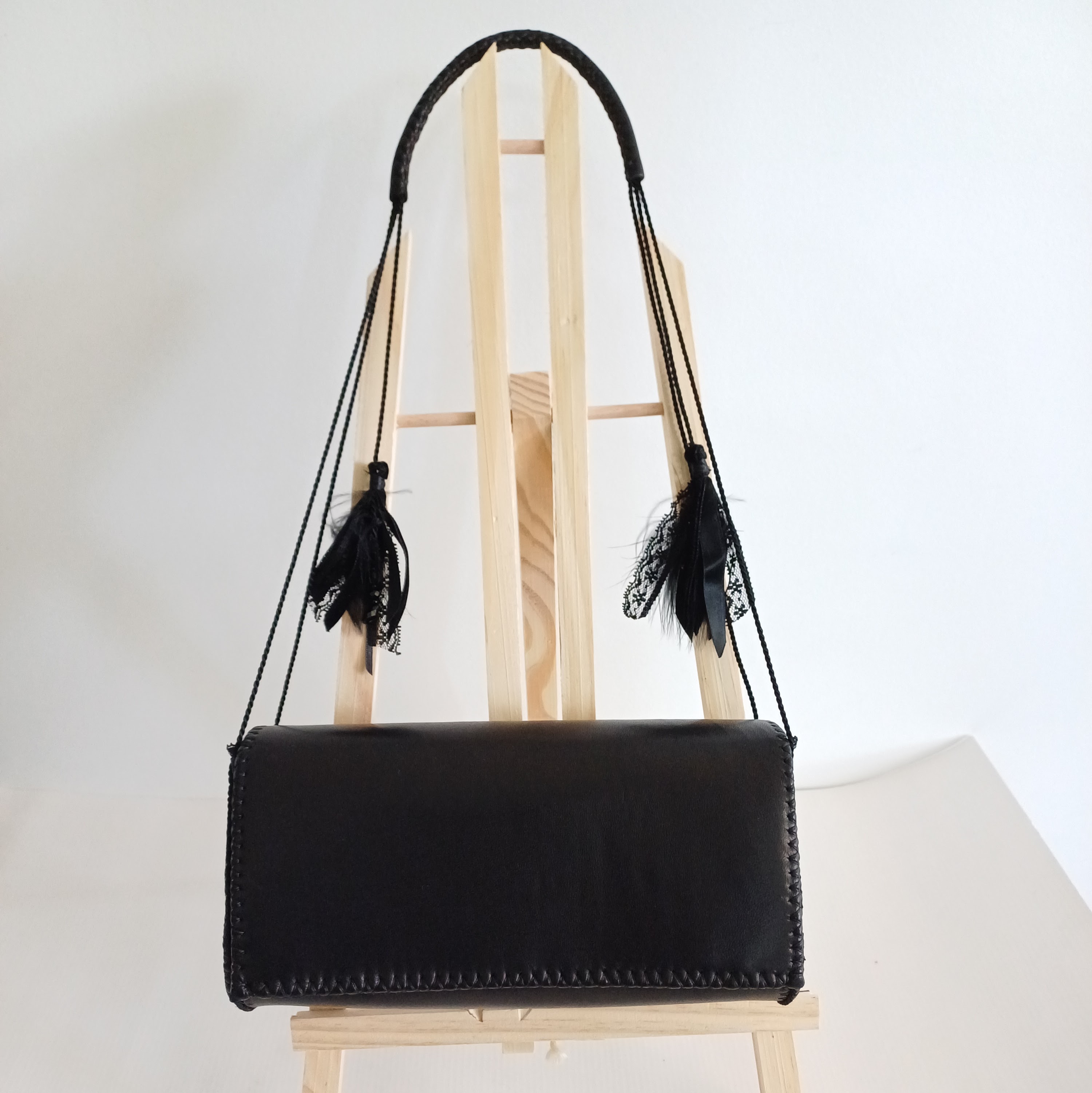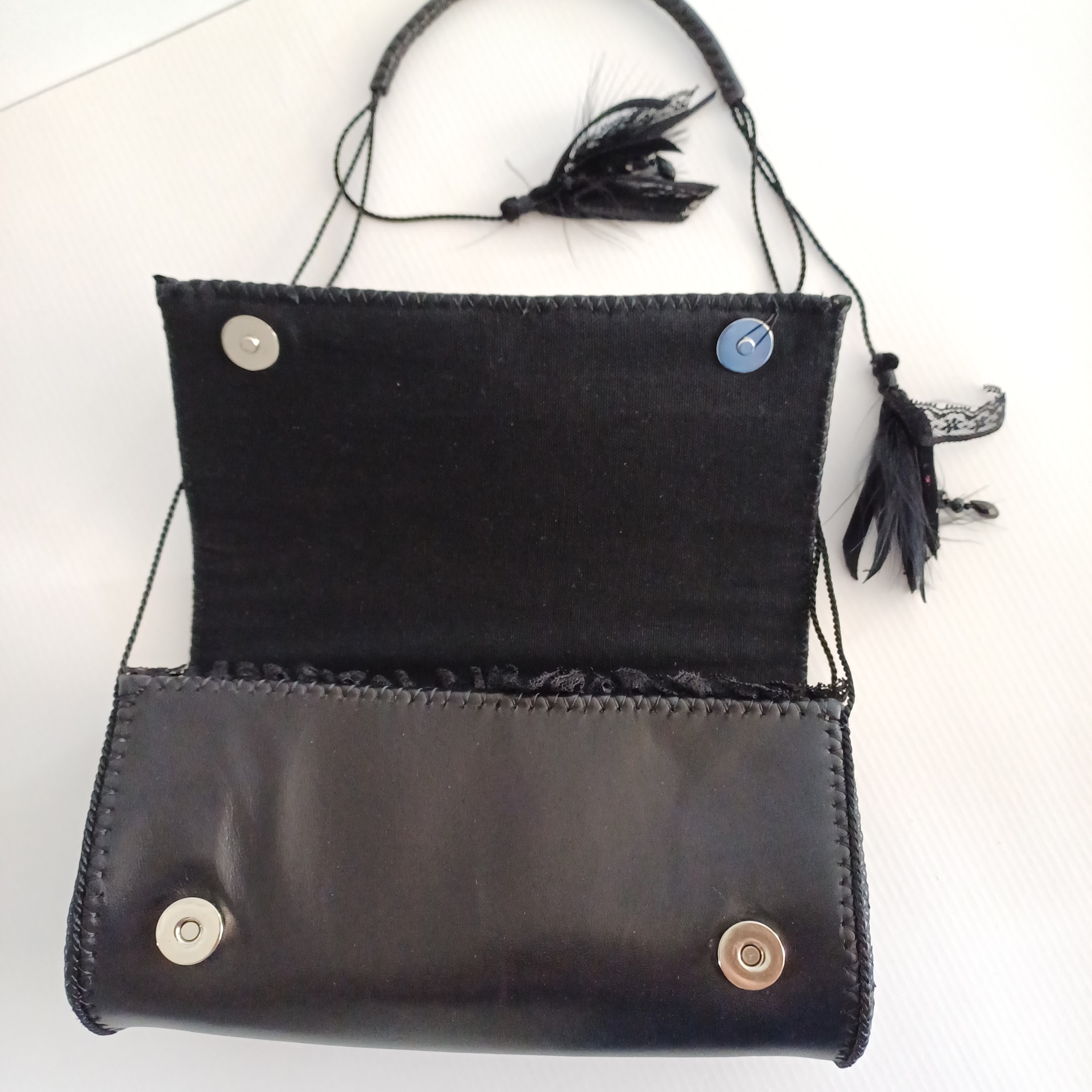 Sac à main en cuir d agneau, cordelette, plumes, dentelle, ruban.